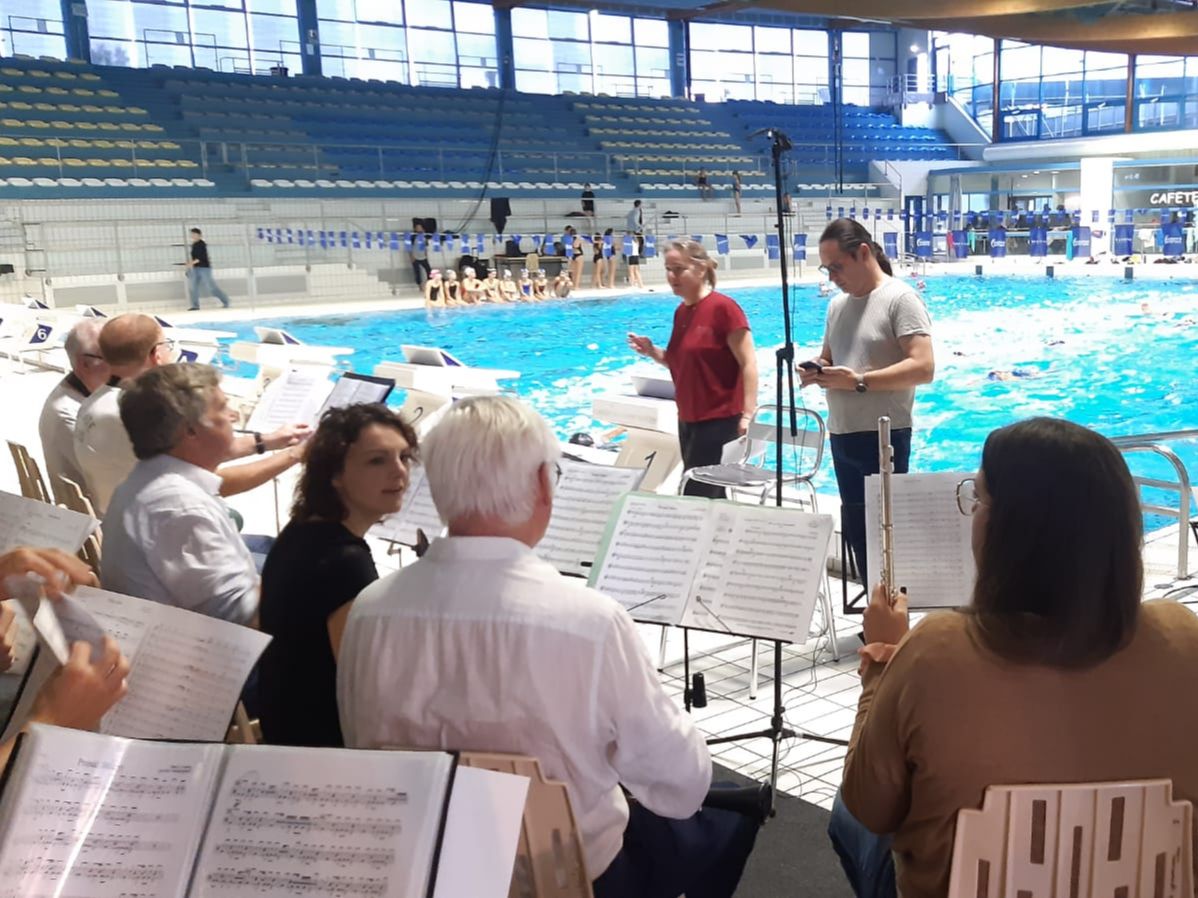 Des musiciennes et musiciens de l'orchestre au bord du grand bassin de la piscine Jean-Bouin pour fêter les 60 ans du club Angers Nat’Synchro.